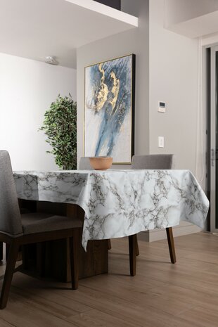 Marmer look is enorm populair! Je ziet steeds meer accessoires met marmer look. Dit tafelzeil heeft een prachtige marmeren look. Het tafelzeil is makkelijk afneembaar, dus ideaal voor gezinnen! Wil je zelf met tafelzeil knutselen of bijvoorbeeld kastjes decoreren met allemaal verschillende stukjes tafelzeil? Dit tafelzeil is al verkrijgbaar vanaf 50 centimeter! - Breedte: 140 centimeter - Lengte: Vanaf 50 centimeter tot 20 meter (een rol tafelzeil) - Weergegeven prijs is per halve meter - Materiaal: Geprint pvc met zachte non woven vliesrug - Machinewasbaar: Nee