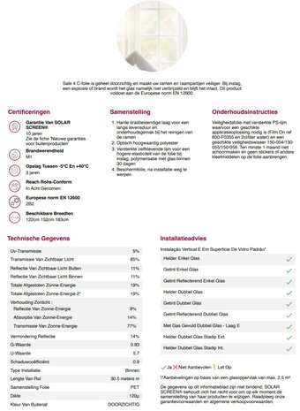 Het veiligheidsfolie van Solar Screen is een raamfolie dat er voor zorgt dat glaswerk niet uiteen spat als er met een voorwerp tegenaan wordt gegooid of als er een persoon tegen aan valt. Door het folie blijven de glasscherven in het raamwerk hangen en is de kans op ernstig letsel veel kleiner. Het veiligheidsfolie is getest volgens Europese normen en wordt geleverd voor zelfmontage. Het folie wordt veel ingezet als doorvalbeveiliging bij scholen, kinderdagverblijven, openbaar vervoer en recreatiebedrijven. - Merk: Solar Screen - Breedte: Circa 61 cm - Lengte: zelf kiezen vanaf 50cm tot aan een hele rol van 30 meter - Dikte folie: 100 micron - Biedt 12-15 jaar optimale bescherming - Weergegeven prijs is per halve meter - Voldoet aan Europese norm EN 12600