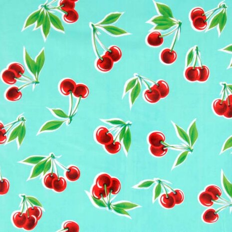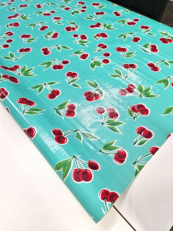 Kitsch Kitchen tafelzeil met kersen creëert een stijlvolle sfeer in huis. Dit mintkleurige tafelzeil is zo sterk dat het zelfs gebruikt wordt om er tassen en andere leuke accessoires mee te maken. Het pvc tafelkleed is met een vochtig doekje makkelijk af te nemen. Het is sfeervol, decoratief en functioneel op tafel en al verkrijgbaar vanaf 50 centimeter. - Breedte: 120 centimeter - Lengte: Vanaf 50 centimeter tot 11 meter (een rol tafelzeil) - Prijs: Weergegeven prijs is per halve meter - Materiaal: Bedrukt PVC, harde rug en dun laagje draadjes textiel - Machinewasbaar: Nee