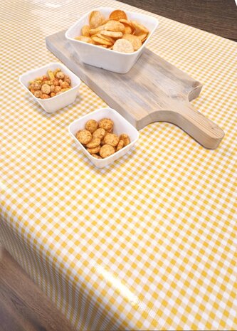 Vrolijk en een tintje zomers, dat is dit Kitsch Kitchen tafelzeil met ruitjes geel. Dit zeil is heel gemakkelijk afneembaar en is dus ook ideaal geschikt voor de keukentafel en voor mensen met kinderen. Wil je zelf met tafelzeil knutselen of bijvoorbeeld kastjes decoreren met allemaal verschillende stukjes Mexicaans tafelzeil? Dit tafelkleed is al verkrijgbaar vanaf 50 centimeter! Bestel je een hele rol, dan profiteer je van een hoge korting! - Breedte: 120 centimeter - Lengte: Vanaf 50 centimeter tot 11 meter (een rol tafelzeil) - Profiteer van korting op een volle rol - Weergegeven prijs is per halve meter - Materiaal: Bedrukt PVC, harde rug en dun laagje draadjes textiel - Machinewasbaar: Nee