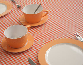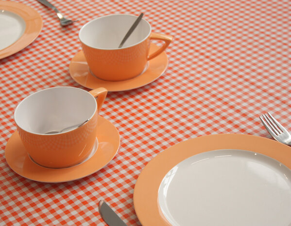 Oranje tafelzeil met ruitjes van Kitsch Kitchen. Een lekkere frisse kleur die niet alleen tijdens Koningsdag en het EK en WK op tafel hoeft te liggen. Dit zeil is zo sterk dat het zelfs gebruikt wordt om er tassen en andere leuke accessoires mee te maken. Het pvc tafelkleed is met een vochtig doekje makkelijk af te nemen. Het is sfeervol, decoratief en functioneel op tafel en al verkrijgbaar vanaf 50 centimeter. Bestel je een hele rol? Dan profiteer van je een hoge korting! - Breedte: 120 centimeter - Lengte: Vanaf 50 centimeter tot 11 meter (een rol tafelzeil) - Weergegeven prijs is per halve meter - Profiteer van korting op een volle rol - Materiaal: Bedrukt PVC, harde rug en dun laagje draadjes textiel - Machinewasbaar: Nee
