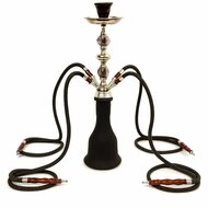 Waterpijpen, ze zijn er in allerlei soorten en maten! Deze middelgrote waterpijp heeft een uniek design met mat zwarte vaas. De schacht heeft vier uiteinden, waardoor het mogelijk is om met meerdere mensen tegelijk te roken. Erg leuk dus voor als je met vrienden bijvoorbeeld een weekendje in een huisje van Center Parcs zit of als er voor jou een feestje in het verschiet ligt. Bestel ook een rol waterpijpkooltjes en Al Fakhar waterpijptabak zodat je bij ontvangst gelijk je waterpijp kunt uittesten.